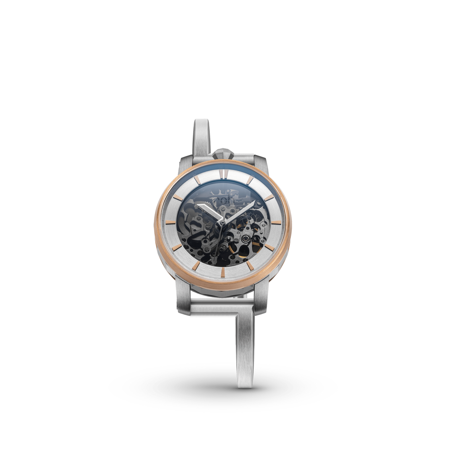 Automatic watch with a 36mm diameter, the R360 stands out with its cylindrical case, laying on the wrist like a real mechanical piece of jewelry.