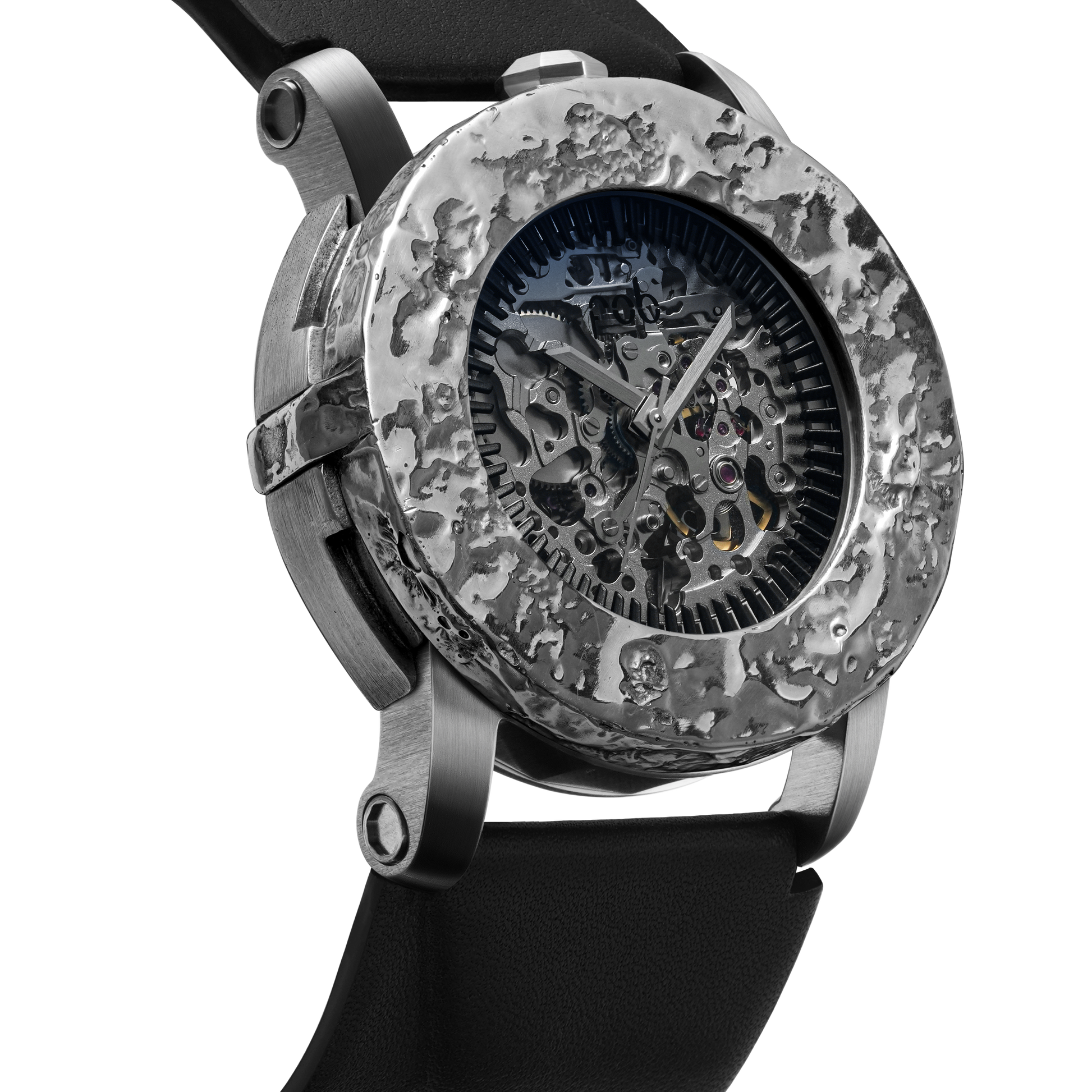 The iconic R413 model is reimagined through a Brutalist design, enhanced by exceptional materials: solid silver, rough diamonds, white gold or yellow gold, depending on the variant. Each piece carries the distinctive signature of PARTS OF FOUR, showcasing the skeleton automatic movement of each watch.