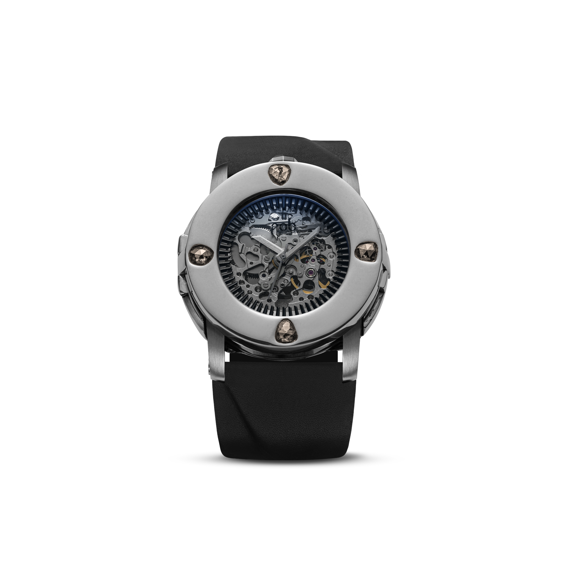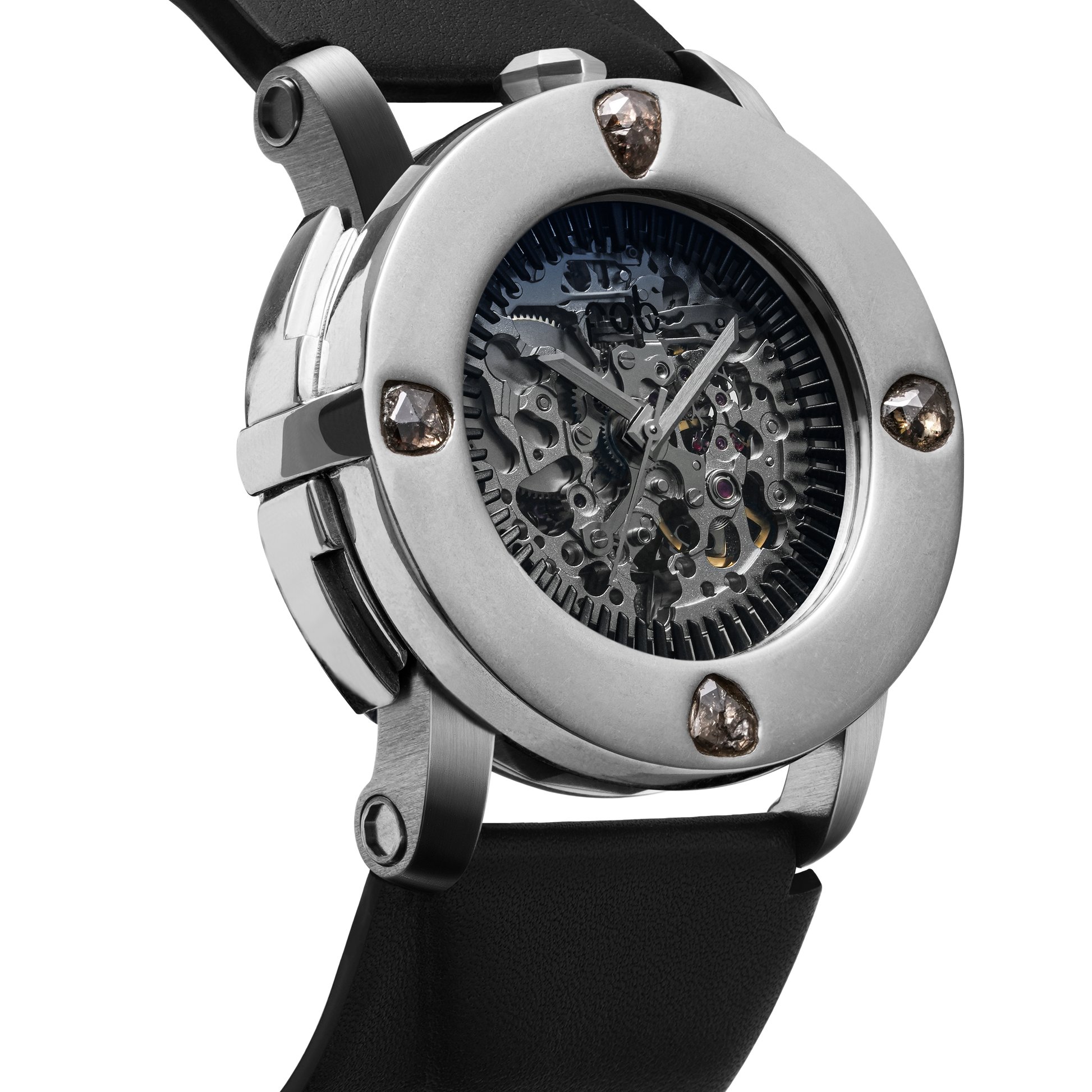 The iconic R413 model is reimagined through a Brutalist design, enhanced by exceptional materials: solid silver, rough diamonds, white gold or yellow gold, depending on the variant. Each piece carries the distinctive signature of PARTS OF FOUR, showcasing the skeleton automatic movement of each watch.