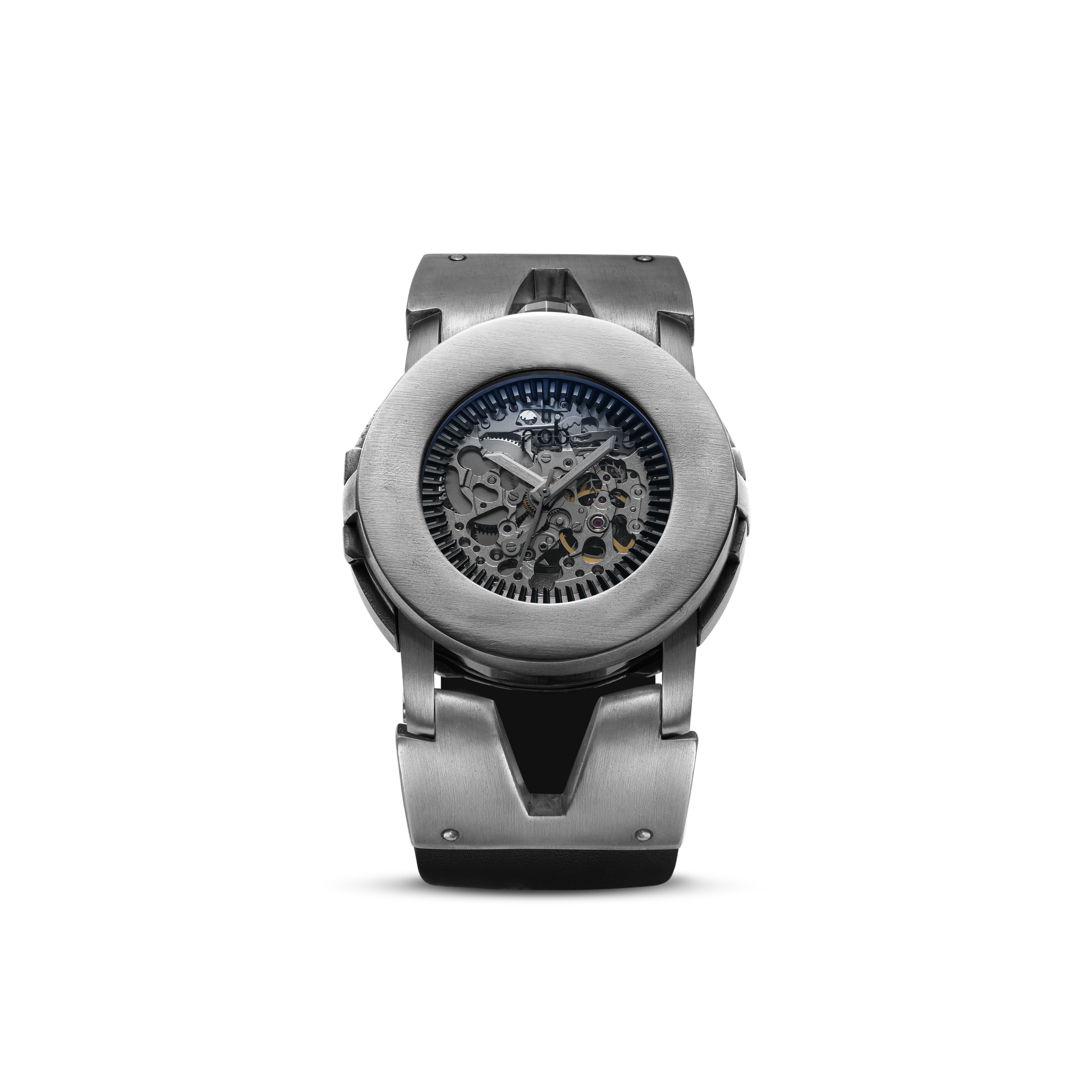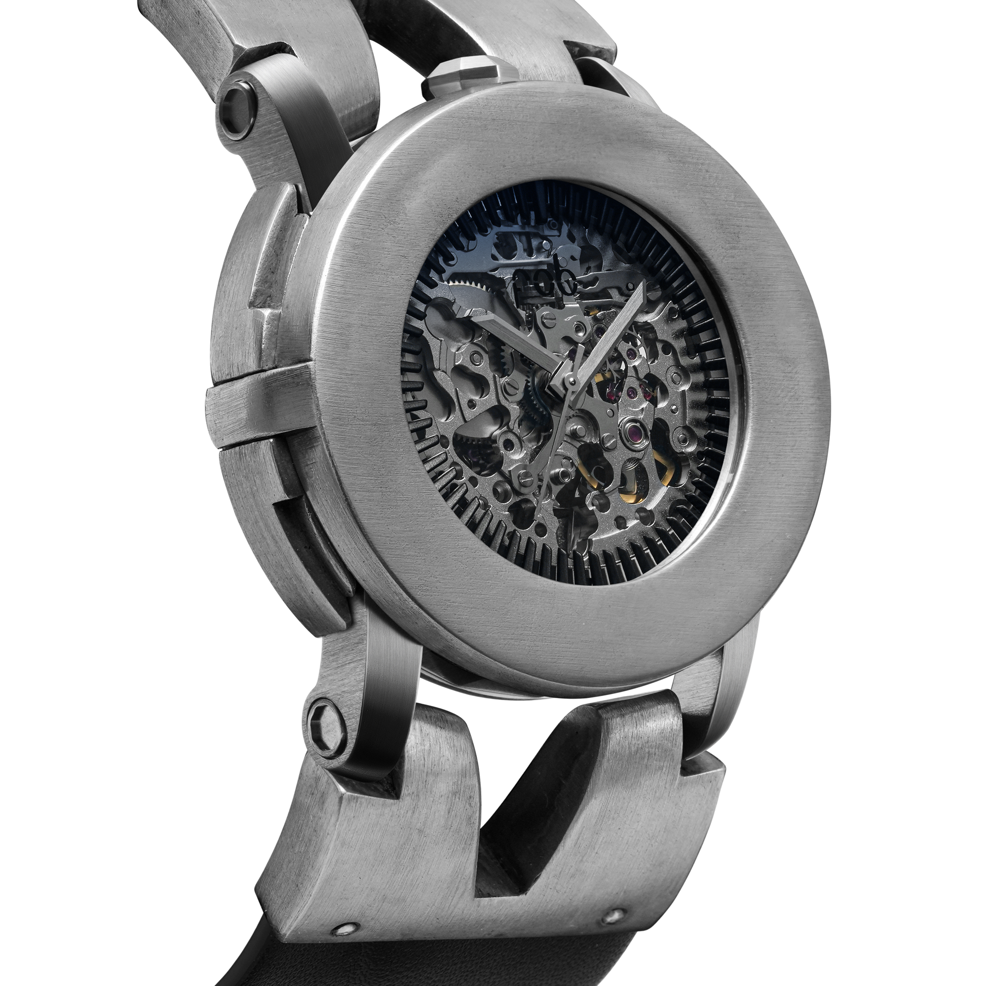The iconic R413 model is reimagined through a Brutalist design, enhanced by exceptional materials: solid silver, rough diamonds, white gold or yellow gold, depending on the variant. Each piece carries the distinctive signature of PARTS OF FOUR, showcasing the skeleton automatic movement of each watch.