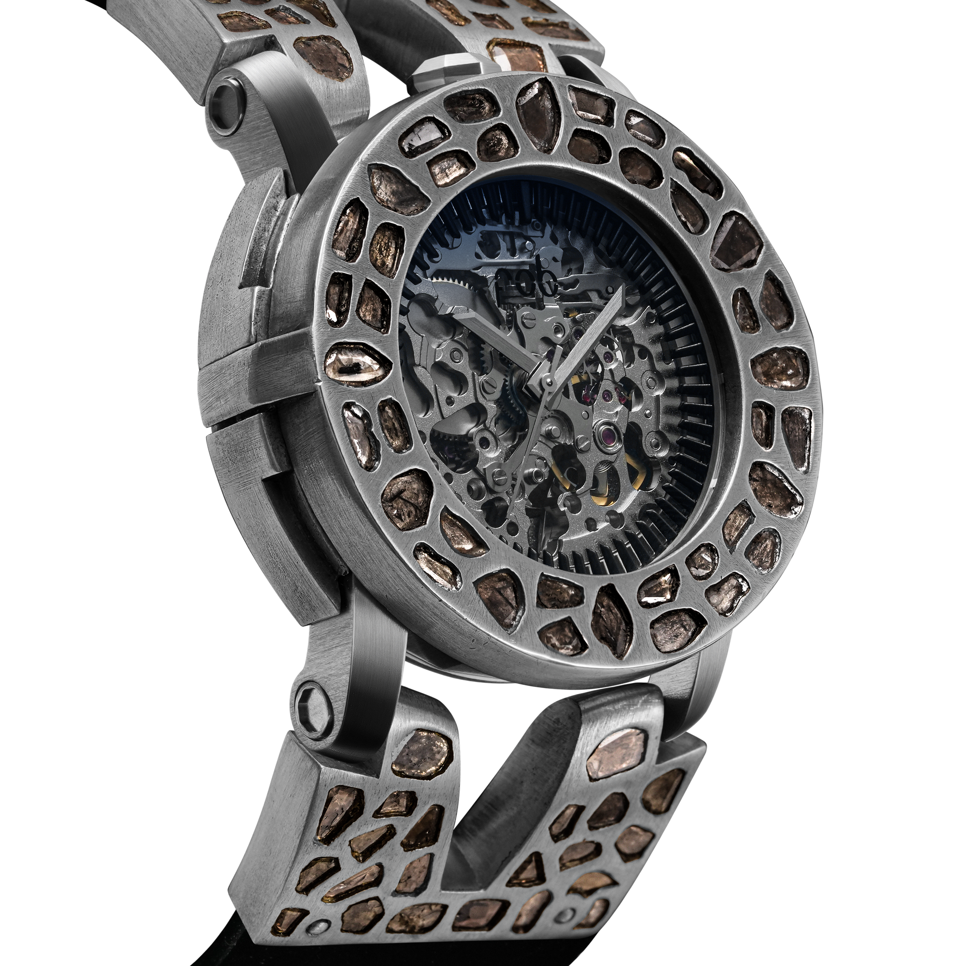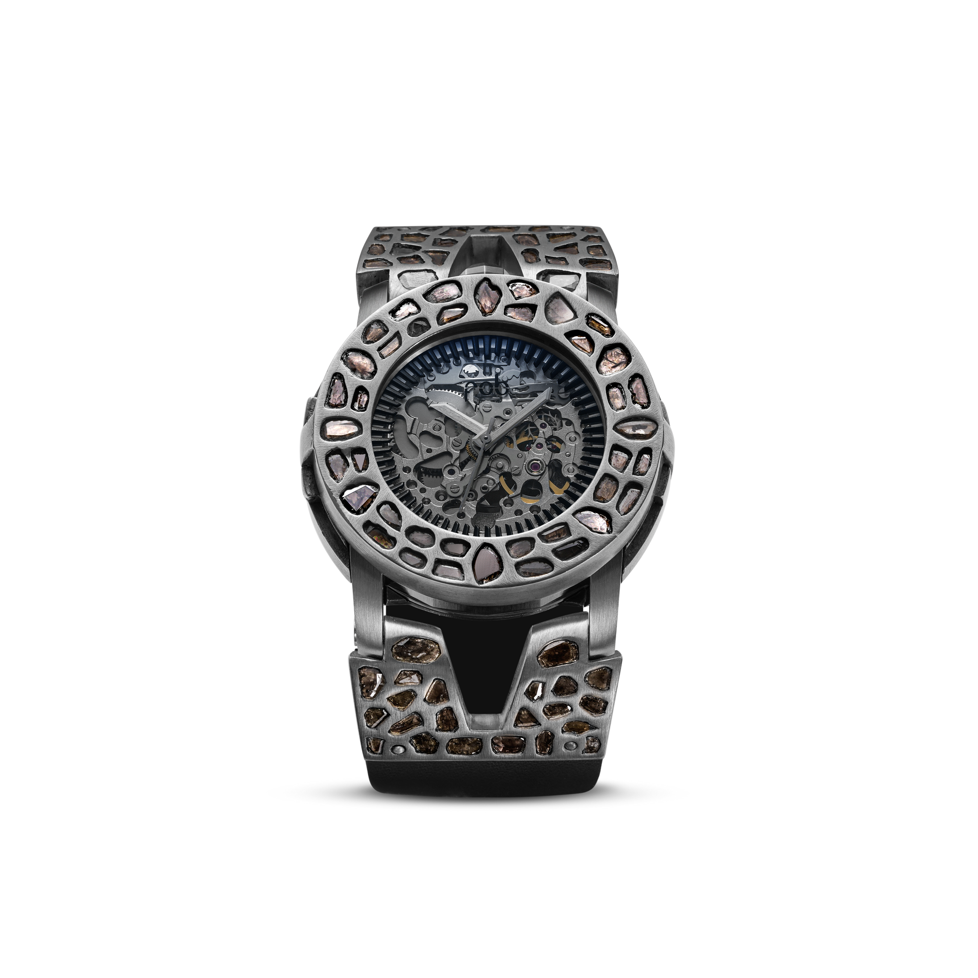The iconic R413 model is reimagined through a Brutalist design, enhanced by exceptional materials: solid silver, rough diamonds, white gold or yellow gold, depending on the variant. Each piece carries the distinctive signature of PARTS OF FOUR, showcasing the skeleton automatic movement of each watch.